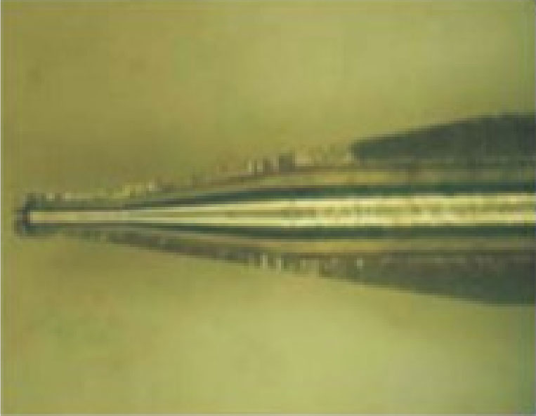 - 適用于點膠范圍較為狹窄的針頭,為了避免點膠時與 器件內(nèi)部碰撞,不改變針頭內(nèi)徑,將外徑縮小。一般 的針頭前端壁厚是50μm,細(xì)針頭最小可做到25μm, 能有效解決狹窄空間點膠難問題。